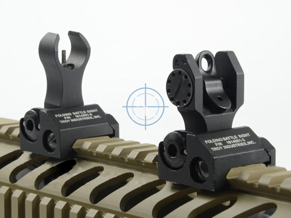 The factory sights are a windage and elevation-adjustable rear ghost ring, and serrated and protected front blade, both removable should you want to use that rail up top for a scope.